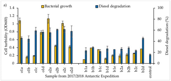 Screening of bacterial consortia growth and diesel degradation obtained from Antarctic seawater samples collected in (a) 2017/18 and (b) 2018/19; all consortia grown in BH media, supplemented with 20 ppt NaCl and 1.0% initial diesel concentration as sole carbon source. Vertical bars indicate SEM of three replicates.