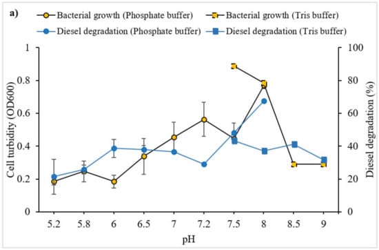 The pH value of the surrounding environment plays a crucial role in microbial mineralisation of diesel as a sole carbon source. Surface ocean water worldwide, including in the Antarctic, is alkaline, typically ranging from pH 7.9 to 8.2 [,]. Generally, the buffering capacity of seawater reaches a minimum at a pH value of approximately 7.5 [,], consistent with the non-significant difference in diesel degradation observed here between pH 7.5 and 8.0 in the phosphate buffer system. The pH of the growth medium influences microbial growth and metabolism, enzymatic activities, transport processes and nutrient solubility []. Many heterotrophic bacteria, and in particular soil-dwelling species, perform optimally at a pH close to neutral (e.g., []). However, marine bacteria can survive and grow in a slightly alkaline environment [,]. Marine microbes can also adapt to changes in environmental pH [], although maintain a cytoplasmic pH between 7.4 and 7.8 [] that is compatible with optimal function and structural integrity of the cytoplasmic proteins that support growth []. The presence of phosphorus-containing compounds in the experimental buffer system used may itself have made a nutritional contribution to the microbial cells encouraging bacterial growth []. In the oceanic environment, the natural concentration of P is non-limiting for microbial uptake. However, under oil spill conditions, the concentration of P is altered and it can become a limiting factor [].