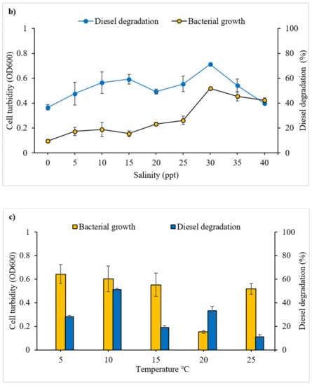 Effect of (a) varying pH (using two buffer systems), (b) salinity (% w/v) and (c) temperature on bacterial consortium growth and diesel degradation. Vertical bars indicate SEM of three replicates.