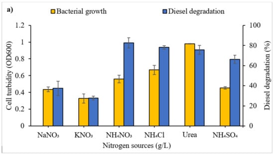 The enhancement in the degradation achieved in the presence of NH3NO4 (Figure 4a) may be explained by the fact that hydrocarbons exist in a reduced state, and they are oxidised by microbes using electron acceptors. Since oxygen can also become a limiting factor, electron acceptors added to substitute for oxygen may indicate that the nitrate ion provided the next best alternative []. Nitrate gives high oxidation potential for the removal of hydrocarbon contamination []. Moreover, the additional N can act as a macronutrient supporting the synthesis of amino acids and nucleic acids and allowing rapid cell growth in the medium []. Diesel reduction was considerably higher in NH3NO4, urea, NH4Cl and NH4SO4. However, the choice of the nitrogen source is also influenced by cost and environmental impacts. Urea is considered to be an expensive source of nitrogen in comparison to NH3NO4 []. NH3NO4 is predominantly used and manufactured for applications in agriculture, mining, quarrying and civil construction [].