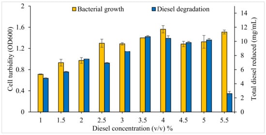Effects of initial diesel concentration (v/v) on bacterial consortium o2b growth and diesel degradation. Vertical bars indicate SEM of three replicates.