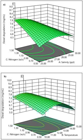 Screening using PBD evaluates the influence of each of the selected environmental parameters separately on the degradation process []. In this study, all of the independent environmental factors were significant. The subsequent use of CCD allowed identification of the significant pairwise interactions between them (Figure 6). The optimisation results obtained through RSM revealed that the data fitted well with the quadratic model (Table 7). CCD predicted higher diesel biodegradation at lower salinity and higher nitrogen concentration. However, the response surfaces generated also support the adaptability or flexibility of the hydrocarbon-degrading members of bacterial consortium o2b, which can tolerate varying salinity levels while still maintaining considerable, if sub-optimal, biodegradation ability.