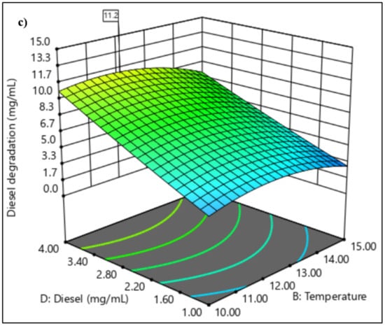 To determine the optimal levels of each parameter for maximum diesel oil biodegradation, three-dimensional response surface plots were constructed by plotting the response (diesel degradation, mg/mL) on the z-axis against any two independent parameters, while maintaining other parameters at their optimal values. These surface plots allowed for visualisation of the optimum values of each parameter that yielded the highest response. Figure 6a shows the interaction between salinity and nitrogen concentration. The combination of higher nitrogen concentration and lower salinity led to the greatest diesel degradation, reaching a maximum of 8.1 mg/mL with 1.5 g/L NH4NO3 and 25 ppt NaCl with temperature and diesel concentration held at 10 °C and 4.0% (v/v), respectively. Figure 6b illustrates the interaction between NH4NO3 concentration and temperature at a constant temperature. Diesel degradation was greatest between temperatures of 11 °C and 13 °C at the highest NH4NO3 concentration of 1.5 g/L with 8.1 mg/mL mass reduction from 18.54 mg/mL initial diesel concentration. Lower degradation values were predicted for higher temperatures, suggesting the inactivation of hydrocarbon-degrading enzymes and key metabolic players. Figure 6c shows the interaction between temperature and initial diesel concentration. Higher diesel reduction of 11.2 mg/mL was observed at lower temperatures of 10–12 °C.