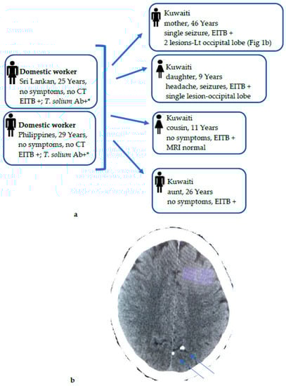 (a) Diagnostic workout and contact tracing of cysticercosis infection among 6 NCC households, 4 Kuwaiti family members (mother, daughter, aunt, and cousin), and 2 domestic workers, all living in the same house. The possible source of T. solium infection was linked to 2 domestic workers from Sri Lanka and Philippines, who showed high levels of anti-T. solium taeniasis-specific IgG antibodies detected by ELISA using T. solium-specific rES33 antigen *. (b) CT scan of Kuwaiti mother with NCC who presented with a single tonic clonic seizure. Her CT scan showed 2 calcified lesions on the left occipital lobe (marked by arrows), with no surrounding edema. She was also positive for cysticercus-specific IgG antibodies by EITB.