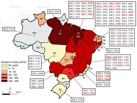 Geographical distribution of L. infantum clinical strains tested in this study. The map was colored according to the number of cases registered in 2019 as reported in Brasil [22]. Numbers inside each Brazilian state represent the number of strains that originated there. The reference strain NLC is represented in red and underlined. (*) Strains were allocated according to the geographic region in which the parasite was isolated, when the state in which the infection occurred was not confirmed. Strains used in the initial amastigote assays are highlighted in red.