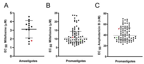 Susceptibility of L. infantum strains to miltefosine. Black dots represent the EC50 determined for each clinical strain. The red and green dots represent the EC50 for L. infantum NLC/IOCL3241 (reference strain) and L. donovani LD-15, respectively, used as internal controls. Graphics show median EC50 (dotted line) and 25% and 75% percentiles (solid lines). (A) Susceptibility of L. infantum intracellular amastigotes to miltefosine, calculated from at least two independent experiments, each performed in triplicate. (B) Susceptibility of L. infantum promastigotes to miltefosine. The results shown are the mean of at least three independent experiments, each performed in triplicate. (C) Susceptibility of L. infantum promastigotes to amphotericin B; mean of two experiments performed in triplicate.