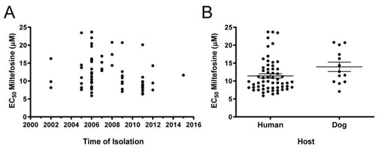 Dispersion analysis of the EC50 for miltefosine determined in 73 Brazilian L. infantum strains according to (A) year of isolation and (B) provenance of host. Each black dot represents one clinical strain. In (B), the central lines represent mean EC50 and SEM of strains. No significant differences between samples originating from humans or dogs were observed (p = 0.0950 two-tailed unpaired t-test with Welch’s correction).