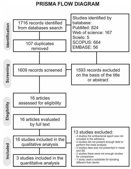 This systematic review and the meta-analysis were executed in accordance with the PRISMA 2020 guidelines [41]. The following PICOS framework was used: population, human dentin; intervention, application of universal adhesives modified by antimicrobial agents; control, application of universal adhesives according to the instructions of the manufacturer; outcomes, growth of S. mutans and bond strength; and study design, in vitro studies. The research question was: “Does the modification of universal adhesive systems by antimicrobial agents inhibit the growth of Streptococcus mutans, and improve the bond strength to dentin?”