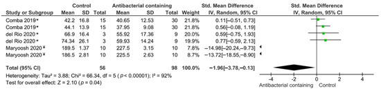 Meta-analyses were performed using a software program (Review Manager v5.4.1; The Cochrane Collaboration, Copenhagen, Denmark). The analyses were performed using the random-effects model, and pooled effect estimates were obtained by comparing the standardized mean difference between bond strength values of unmodified universal adhesives versus the antibacterial containing universal adhesive. In studies where several experimental groups were compared with the same control group, data from the experimental groups (mean, standard deviation, and sample size) were combined [42]. A p-value < 0.05 was considered statistically significant. Statistical heterogeneity of the treatment effect among studies was assessed using the Cochran Q test and the inconsistency I2 test.