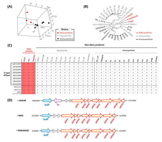 Three-dimensional principal component analysis (PCA) of strains derived from dairy products, diseased fish, and processed food based on the profiling of KEGG Ontology (ko) genes (A). Clustering of 30 strains of Carnobacterium maltaromaticum isolated under different conditions (B). The accessory genes and ko_id that shared only dairy strains among 30 strains of C. maltaromaticum (C). The serial array of sulfate permease (SulP), transposase (Tn), and the components of V-type ATPase (ATPVA, ATPVB, ATPVC, ATPVD, ATPVE, ATPVF, ATPVI, and ATPVK) in the dairy strains of chromosomal DNA (D).