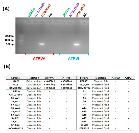 PCR products (ATPVA- and ATPVI-specific primers) using 18ISCm, ATCC35586, and DSM20342 genomic DNA (A). The results of in silico PCR for all 30 strains. The results of in silico PCR for all 30 strains isolated from dairy products, diseased fish, and processed food. + denotes positive amplification and the expected amplification size is indicated in the parentheses. - denotes no amplification in in silico PCR (B).