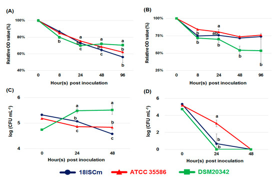 Relative OD value at 8, 24, 48, and 96 hpi in 1/10 TSB (pH 10; (A)) and pH 10 PBS (pH 10; (B)), respectively. Viable bacterial count at 24 and 48 hpi in 1/10 TSB (pH 10: (C)) and pH 10 PBS (pH 10; (D)), respectively. Different letters indicate statistically significant differences determined by Duncan’s multiple range test under the same sampling time points (p < 0.05).