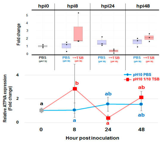 Relative V-type ATPase Subunit A (ATPVA) gene expression in DSM20342 strain under PBS and 1/10 TSB at pH 10. The dots in the box plot indicate the fold change of each sample compared to hpi0. Different letters indicate statistically significant differences determined via Duncan’s multiple range test among all groups (p < 0.05).