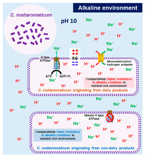 This study found that only dairy strains carried V-type ATPase based on comparative genomic analysis of 30 C. maltaromaticum strains. V-type ATPase consumes ATP in a nutrient-rich environment, enabling the influx of protons into the cell, which results in the development of resistance to highly alkaline conditions. Taking into account that dairy C. maltaromaticum has to survive and stay in alkaline-ripening dairy products for a long time, harboring the V-type ATPase could facilitate their proper adaptation to the environment. We suggest that V-type ATPase could be an important genetic feature used by C. maltaromaticum in dairy products to adapt to the alkaline environment resulting in the phenotypic characteristic of high-alkaline resistance in nutrient-rich environments.