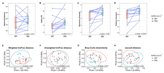 We calculated the alpha diversity, such as observed feature, Faith’s phylogenetic diversity (PD), Shannon’s index, and Pielou’s evenness, in the QIIME2 package. For paired samples at two time points (RP SARS-CoV-2 and RN SARS-CoV-2), the Wilcoxon signed-rank exact test was used to perform a hypothesis test of alpha diversity in the RStudio (Version 1.3.1073).