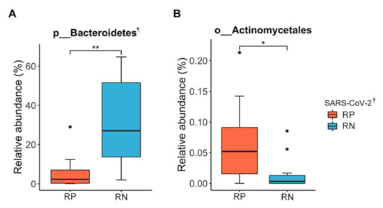 Significantly different taxa profiles of gut microbiota between infected (respiratory positive (RP)-SARS-CoV-2) and recovered (respiratory negative (RN)-SARS-CoV-2) states of patients with COVID-19. (A) The relative abundance of phylum Bacteroidetes. ¶ The phylum Bacteroidetes, class Bacteroidia, and order Bacteroidales showed the same abundance and statistically significant differences. (B) The relative abundance of the order Actinomycetales. The RP-SARS-CoV-2 as a baseline, the two time points as a fixed effect, and subjects’ IDs as a random effect were used in the mixed model using MaAsLin2. * FDR q < 0.05, ** FDR q < 0.01. † SARS-CoV-2 RNA from the respiratory tract. RP, respiratory positive SARS-CoV-2; RN, respiratory negative SARS-CoV-2.