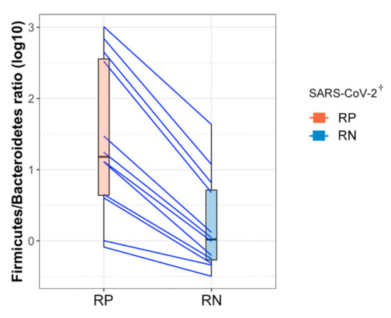 Comparison of Firmicutes to Bacteroidetes ratio in paired samples diagnosed with COVID-19. Each point on the left and right sides of the slope graph corresponds to the samples collected in the infected state (respiratory positive (RP)-SARS-CoV-2) and in the recovered state (respiratory negative (RN)-SARS-CoV-2), respectively. Paired samples from the same subject are connected with a blue line showing the change in the ratio. † SARS-CoV-2 RNA from the respiratory tract. RP, respiratory positive SARS-CoV-2; RN, respiratory negative SARS-CoV-2.