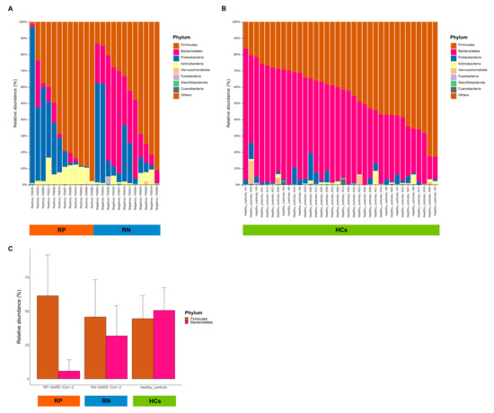 Comparison of taxonomic compositions of gut microbiota at the level of phylum. (A) Relative abundance of phyla between two time points (respiratory positive (RP)-SARS-CoV-2 and respiratory negative (RN)-SARS-CoV-2) in 12 patients with COVID-19. (B) Relative abundance of phyla in 36 individuals as healthy controls (HCs). (C) The mean relative abundance of Firmicutes and Bacteroidetes among patients with COVID-19 and HCs.