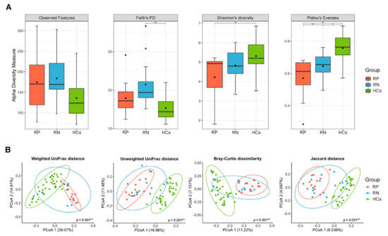 Comparison of the gut microbial diversity among respiratory positive (RP)-SARS-CoV-2, respiratory negative (RN)-SARS-CoV-2, and healthy controls. (A) Alpha diversity. The interquartile range (IQR) is the 25th to 75th percentile. The median and mean values are shown as a line and diamond within the box, respectively. The p-values were calculated using mixed model. (B) Beta diversity. Each point represents a single sample with ellipses for the 95% confidence interval for each group. The p-values were calculated using pairwise permutational multivariate analysis of variance (PERMANOVA) test with 999 random permutations. * p < 0.05, ** p < 0.01. RP, respiratory positive SARS-CoV-2; RN, respiratory negative SARS-CoV-2; HCs, healthy controls.