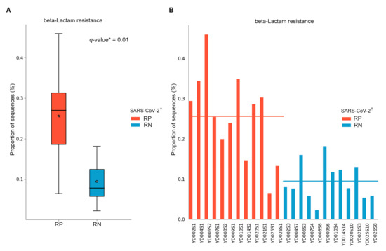 Inferred gut microbiota functions by PICRUSt2 from 16S rRNA gene sequences between infected (respiratory positive (RP)-SARS-CoV-2) and recovered (respiratory negative (RN)-SARS-CoV-2) states of patients with COVID-19. (A) The predicted mean relative abundance of beta-lactam resistance (ko00312 from KEGG pathway) between RP-SARS-CoV-2 and RN-SARS-CoV-2. Box plots denote the top quartile, median and bottom quartile, and white stars mean the average value. All the differences were analyzed using Wilcoxon signed-rank exact test followed by Benjamini–Hochberg FDR method, which was used to correct multiple comparisons (* q < 0.05). (B) The predicted mean relative abundance of beta-lactam resistance in individual-based bar plot in 12 patients with COVID-19. Each red and blue bar is aligned according to the same patient pair. † SARS-CoV-2 RNA from the respiratory tract. RP, respiratory positive SARS-CoV-2; RN, respiratory negative SARS-CoV-2.