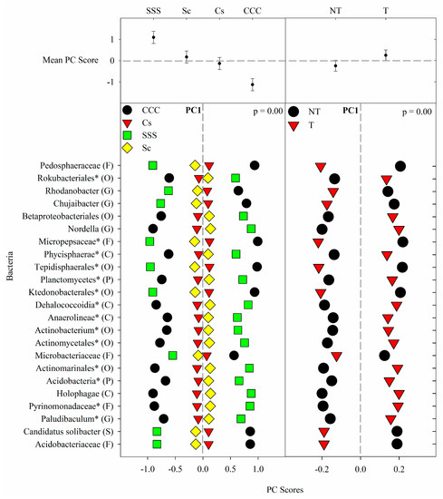 Mean bacterial principal component scores (PC) following 20 years of rotation and tillage treatments. Top panels show the bacterial mean PC score for both crop rotation and tillage main effects for PC1 based on the analysis of variance (ANOVA); error bars represent standard errors of the mean PC scores. Bottom panels show relative abundances (RAs) for each bacterial indicator ASVs by crop rotation and tillage effects. The main effects for PC1 are shown as CCC, continuous corn; Cs, corn phase of the corn-soybean rotation; Sc, soybean phase of the corn-soybean rotation; SSS, continuous soybean; NT, no-till; T, chisel tillage. For each taxon, the response of each ASV was calculated as the mean PC score multiplied by the PC loading score of a given ASV. The y-axes show the name of the ASV’s most explanatory taxonomic rank in parentheses (P, phylum; C, class; O, order; F, family; G, genus; S, species). The “*” after an ASV means it is uncultured.
