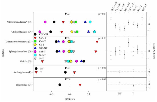 Mean bacterial principal component scores (PC) following 20 years of rotation and tillage treatments. Right panels show the bacterial mean PC score for the crop rotation × tillage interaction for PC2 and PC3 and a tillage effect for PC4 and PC5 based on the analysis of variance (ANOVA); error bars represent standard errors of the mean PC scores. Left panels show relative abundances (RAs) for each bacterial indicator ASVs by crop rotation × tillage and tillage. The crop rotation × tillage interaction for PC2 and PC3 is shown as CCC-NT, continuous corn, and no-till; CCC-T, continuous corn, and chisel tillage; Cs-NT, corn phase of the corn-soybean rotation and no-till; Cs-T, corn phase of the corn-soybean rotation and chisel tillage; Sc-NT, soybean phase of the corn-soybean rotation and no-till; Sc-T, soybean phase of the corn-soybean rotation and chisel tillage; SSS-NT, continuous soybean and no-till; SSS-T, continuous soybean and chisel tillage. The tillage main effect for PC4 and PC5 is shown as NT, no-till; T, chisel tillage. For each taxon, the response of each ASV was calculated as the mean PC score multiplied by the PC loading score of a given ASV. The y-axes show the name of the ASV’s most explanatory taxonomic rank in parentheses (P, phylum; C, class; O, order; F, family; G, genus; S, species). The “*” after an ASV means it is uncultured.