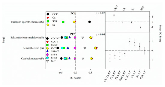 PC1 explained 8% of the variability and contained one significant positive loading from the ASV Fusarium sporotrichioides (S). PC2 explained 7% of the variability and contained positive loadings from Mycosphaerellaceae (F), Gibellulopsis piscis (S), and Plectosphaerella (G). PC3 also explained 7% of the variability and contained positive loadings from Coniochaetaceae (F), Schizothecium (G), and Schizothecium carpinicola (S). PC4 explained 6% of the variability and contained a positive loading from Clonostachys rosea (S). PC5 explained 6% of the variability, however, no significant correlations (loadings ≥ |0.5|) were selected.