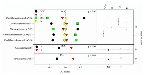 PC1 explained 20% of the variability and contained positive loadings from Candidatus Nitrocosmicus (S), Nitrososphaeraceae (F) (ammonia oxidizer), Nitrososphaeraceae (F); negative loadings came from Nitrososphaeraceae (F) and Candidatus Nitrosotalea (S). PC2 explained 15% of the variability and contained negative loadings from two different Nitrososphaeraceae (F) families. PC3 explained 12% of the variability and contained one positive loading from Woesearchaeia (C). PC4 explained 11% of the variability and also contained one positive loading from Thermoplasmata (C). PC5 explained 10% of the variability and contained opposing loadings, one positive from Thermoplasmata (C) and one negative from Candidatus Nitrososphaera (S).