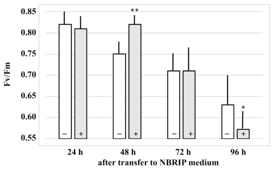 Maximum quantum yield of the photosystem II (Fv/Fm) after the transfer of Arabidopsis seedlings to NBRIP medium. At the time point of transfer to the NBRIP medium, the seedlings were either exposed to Trichoderma (+) or mock-treated (−). Data are based on 5 independent experiments, bars represent SEs. * indicates significant difference of Trichoderma-treated vs. non-treated roots (* p < 0.05; ** p < 0.005).