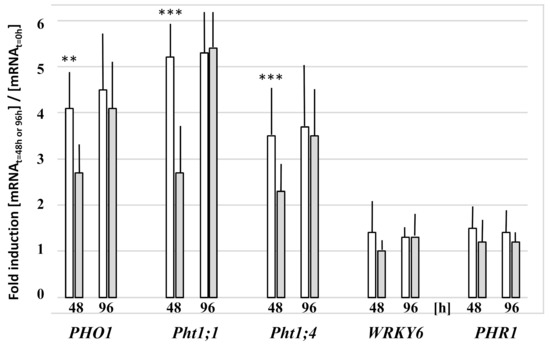 Relative mRNA levels for the Pi transporters Pht1;1 and Pht1;4, as well as the Pi starvation regulators PHO1, WRKY6, and PHR in the roots of Arabidopsis seedlings after transfer to NBRIP medium for 48 h or 96 h. Upon transfer to the NBRIP medium, the seedlings were either cocultured with Trichoderma (grey) or mock-treated (white). The mRNA levels are expressed relative to the levels in the roots at the time point of transfer to NBRIP medium (t = 0 h). Based on 3 independent experiments; bars represent SEs. * indicates significant difference of non-treated vs. Trichoderma-treated roots (** p < 0.005; *** p < 0.001).