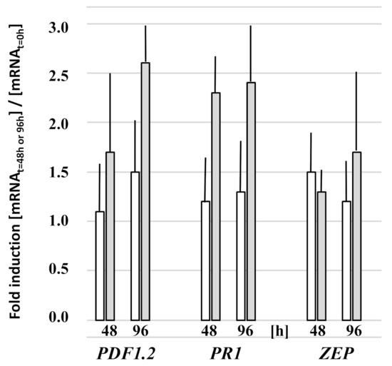 Relative mRNA levels for the defense-related proteins PDF1.2, PR1, and ZEP in the roots of Arabidopsis seedlings after transfer to NBRIP medium for 48 h or 96 h. Upon transfer to the NBRIP medium, the seedlings were either cocultured with Trichoderma (grey) or mock-treated (white). The mRNA levels are expressed relative to the levels in the roots at the time point of transfer to NBRIP medium (t = 0 h). Based on 3 independent experiments; bars represent SEs. No significant differences between the values of Trichoderma-treated vs. non-treated roots.
