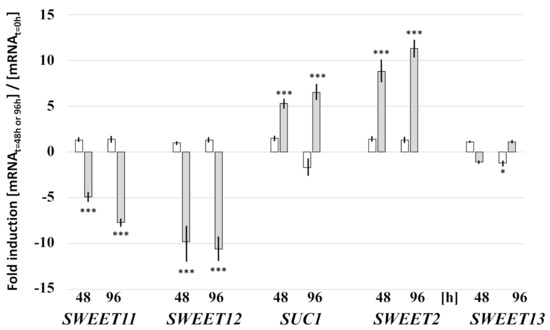 Relative mRNA levels for sugar transporter genes in the roots of Arabidopsis seedlings after transfer to NBRIP medium for 48 h or 96 h. Upon transfer to the NBRIP medium, the seedlings were either cocultured with Trichoderma (grey) or mock-treated (white). The mRNA levels are expressed relative to the levels in the roots at the time point of transfer to NBRIP medium (t = 0 h). Based on 3 independent experiments; bars represent SEs. * indicates significant difference of Trichoderma-treated vs. non-treated roots (* p < 0.05; *** p < 0.001).