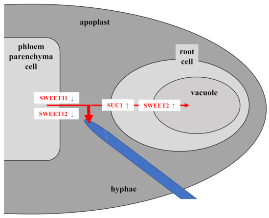 Apoplastic sugar unloading of the phloem in the roots is mainly mediated by SWEET11 and -12 in Arabidopsis roots ([18,40] and refs. therein). The higher demand for sugar due to the propagation of the hyphae results in the stimulation of photo-assimilate translocation from source to sink. In order to restrict sugar loss from the apoplast after unloading of the phloem, the plant downregulates SWEET11 and -12 (Figure 8). The involvement of SWEET transporters in beneficial and pathogenic plant/microbe interactions in roots is well-documented. Several SWEET genes in Brasica crops were significantly upregulated upon P. brassicae infection, the causal agent of clubroot [41]. Clubroot disease stimulates early steps of phloem differentiation and recruits SWEETs within developing galls [42]. Furthermore, MtSWEET11 is a nodule-specific sucrose transporter in Medicago truncatula [17,43,44].