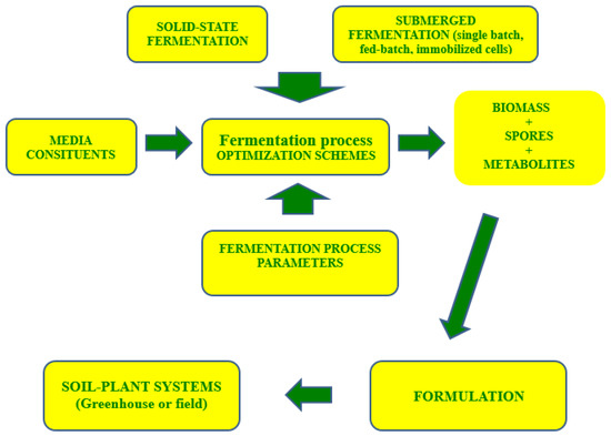 Plant beneficial microorganisms appear as an important alternative to chemical fertilizers and as a part of the sustainable agriculture and scientific efforts to develop healthier soil and food [2,3]. Microorganisms with industrial/commercial interest, which demonstrate plant beneficial properties, are mainly bacteria (Bacillus, Pseudomonas, Rhizobium, and Azotobacter, among others) and fungi (Aspergillus, Penicillium, Trichoderma, Beauveria, Metarhizium, Clonostachys, and mycorrhizal fungi) [4,5,6]. Generally, these microorganisms are involved in the decomposition of the soils’ organic matter, nutrient cycling and management of soil minerals, solubilization of insoluble nutrients, such as phosphate- or potassium-bearing materials, releasing of plant stimulating metabolites, such as phyto-hormones, and the suppression of plant pathogens [7,8,9,10]. It should be noted that many of these manifest more than one of the above activities, as they possess multifunctional properties [11,12]. However, it is also important to mention that only 10% of the soil microorganisms inhabiting zones surrounding plant roots can be cultivated, while the rest are declared uncultivable in standard media [13]. Bearing in mind the key role of soil microorganisms in sustainable agriculture and the concerns regarding crop quality and human health, as well as the problems of a growing human population in combination with climate change, the biotechnological approach in production and formulation of plant beneficial microorganisms should be in the focus of the scientific community [14,15,16]. Biotechnology offers a wide array of techniques leading to bioformulates: starting from selection of promising microbial strains, characterizing their morphological, physiological and biochemical properties, testing their activity under fermentation and soil conditions and, finally, formulating them into commercial products [15,16,17,18]. Scientific literature is abundant with studies on bioinoculants mainly oriented towards isolation and screening of beneficial microorganisms, but studies on fermentation processes and formulation techniques are still lacking [10,19]. Results of a recent analysis in the field of plant beneficial microorganisms suggest a more integrated view of soil inoculants, with a special emphasis on the inoculant production process, including fermentation and formulation processes, and additives [19].