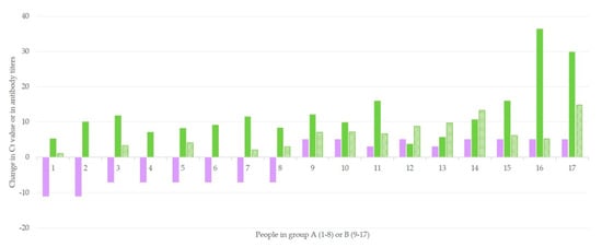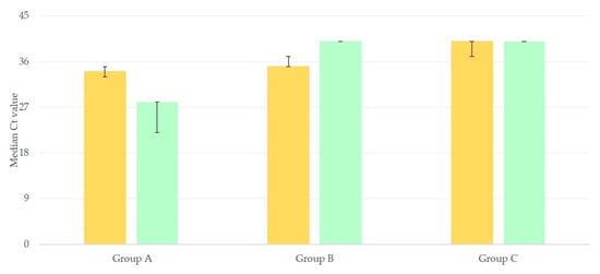N gene for people in group A or B. In group A, a decrease was noted: the median value of Ct decreased from 34 (33–35) to 28 (22–28) (