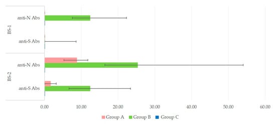 In group A, titers were low at BS-1 and increased at BS-2 for both anti-N and anti-S antibodies: from 0.08 (0.08–0.08) to 8.80 (5.30–11.80) and 1.65 (0.08–4.20), respectively (