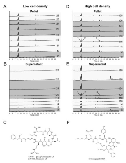 Figure 1. HPLC analysis of samples from a diel growth experiment of Microcystis. Cultures were grown at low (A,B) and high (D,E) cell densities, cell pellets or the culture supernatant were extracted at different time points (t0–t28, numbers indicate hours after the start of the experiment). Lighter and darker shading corresponds to light and dark phases, respectively. Two variants of microcystin (peaks 1 and 2, (C)) and one of cyanopeptolin (peak 3, (F)) were identified.
