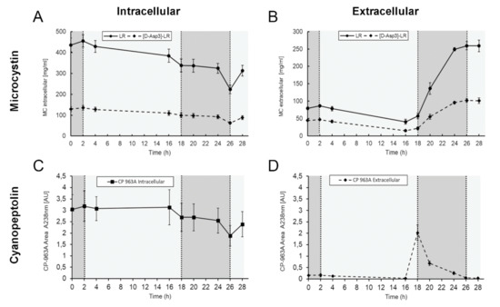 Figure 2. Quantification of microcystin and cyanopeptolin in samples from a diel growth experiment of Microcystis. Based on HPLC elution profiles of intracellular and extracellular extracts, two microcystin variants (A,B) and one of cyanopeptolin (C,D) were quantified with analytical standards. Lighter and darker shading corresponds to light and dark phases, respectively.