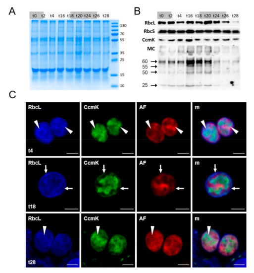 Figure 3. Fluctuations in microcystin-binding and localization of carbon fixation proteins in samples from a diel growth experiment of Microcystis. Protein samples (t0–t28, numbers representing hours since start of experiment) were separated by SDS-PAGE (A) and analyzed by immunoblots (B), detected proteins are named, molecular weight markers are given in kDa. MC binding to proteins increases during the light phase, is highest from t16 to t20 and decreases from t24 to t28. Cells were immunostained and analyzed by confocal microscopy (C), showing that RbcL transiently relocates to the cell membrane at t18. Arrows: regions of peripheral RbcL localization; arrowheads: cytosplasmic RbcL localization. RbcL/CcmK: primary antibodies used; AF: Chlorophyll a autofluorescence; m: merged fluorescence channels. Scale bars: 2 µm.
