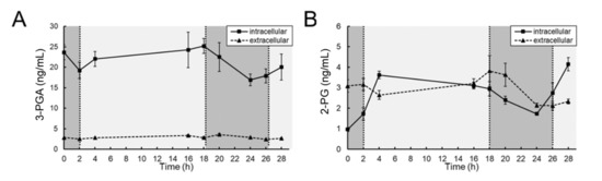 Figure 4. LCMS measurement of steady state levels of 3-PGA and 2-PG in samples from a diel growth experiment of Microcystis. The two products of the carboxylase and oxygenase activities of RubisCO, 3-phosphoglycerate (3-PGA, (A)) and 2-phosphoglycolate (2-PG, (B)), respectively, were quantified intra-and extracellularly.