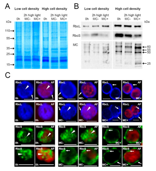 Figure 5. Influence of microcystin added to the growth medium of a liquid culture of Microcystis. Liquid cultures at low and high cell densities were grown at high light with the addition of MC to the growth medium (MC+) or without it (MC−). Protein extracts were analyzed by SDS-PAGE (A) and immunoblots (B), detected proteins are named, molecular weight markers are given in kDa. MC binding to proteins increases after the addition of MC. Cells from high cell density cultures were immunostained and analyzed by confocal microscopy (C) showing a relocation of both RbcL and RbcS to the cell membrane only after MC addition. RbcL/RbcS: primary antibodies used; AF: Chlorophyll a autofluorescence in red fluorescence channel. Distinct accumulations of RbcL and RbcS are highlighted by arrowheads (cytoplasmic) and arrows (peripheral). Scale bars: 2µm.