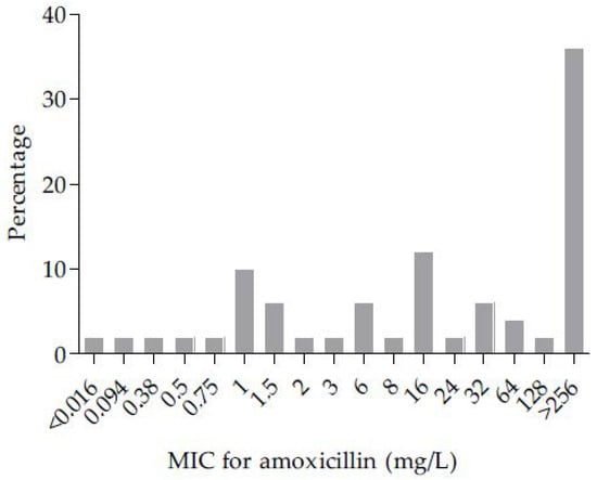 Distribution of minimum inhibitory concentration (MIC) for amoxicillin (mg/L) among the 50 isolates of Prevotella melaninogenica.