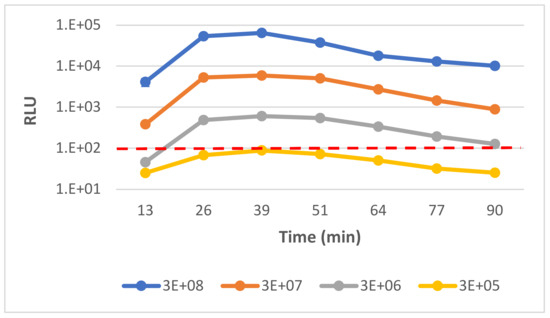 Determining the limit of detection of Y. pestis phage-based diagnostic assay. Detection of Y. pestis Kimberley53Δ70Δ10 strain was tested by phage-based assay. BHI-suspended bacteria were diluted 1:10 with BHI growth medium to a concentration range of 3 × 108–3 × 105 CFU/mL. Diluted cultures were added to a 96-well plate (0.2 mL/well) followed by ϕA1122::luxAB administration (20 µL/well) and incubation at 28 °C in a SPARK 10M plate reader. The bioluminescent signal (RLU) was detected, following 5% n-decanal substrate injection (20 µL/well). The results are representative of one out of three independent biological replicates. Values are the mean of results obtained in three triplicate wells in one biological experiment (error bars represent the standard deviation/STDEV (in some cases error bars are smaller than the symbol size). The limit of detection (RLU = 100) is marked by a red dashed line.
