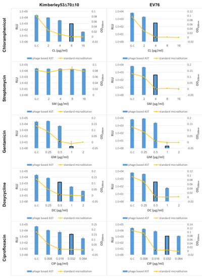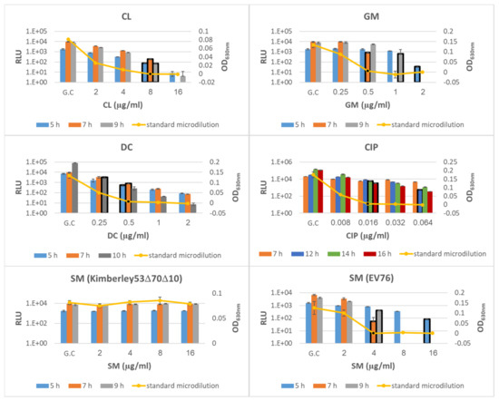 Optimization of the antibiotic exposure period for phage-based AST. Y. pestis strains Kimberley53Δ70Δ10 and EV76 were suspended in MHB to a concentration of ~5 × 105 CFU/mL and were tested simultaneously by phage-based and standard microdilution AST. Bacterial suspensions were divided into 96-well microplates (50 µL/well) already containing 50 µL of each of 5 different antibiotics—CL (chloramphenicol), SM (streptomycin), GM (gentamycin), DC (doxycycline), and CIP (ciprofloxacin)—at various concentration ranges (detailed in Table 2); the microplates were then incubated at 28 °C. For phage-based AST, exposure periods were as follows: CL, SM and GM were tested at 5, 7 and 9 h of exposure; DC was tested at 5, 7 and 10 h; and CIP was tested at 7, 12, 14 and 16 h. All antibiotics were tested using Kimberley53Δ70Δ10, and SM was also tested using EV76. Each graph displays the resulting bioluminescent signals (RLU; bars) of all exposure times and the OD630 values obtained in the standard microdilution tests (yellow curve) following 24 h of antibiotic exposure using one bacterial strain exposed to one antibiotic. MIC value obtained in the phage-based AST was determines as the minimal antibiotic concentration that showed a bioluminescent signal lower than 10% of the bioluminescent signal of the growth control. The MIC values obtained by phage-based AST are marked by a black frame around the relevant bar, and the MIC values obtained by the microdilution test are marked by a black dot. Values are the mean results of 3 wells in the same experiment (error bars represent the standard deviation). GC = Growth Control.
