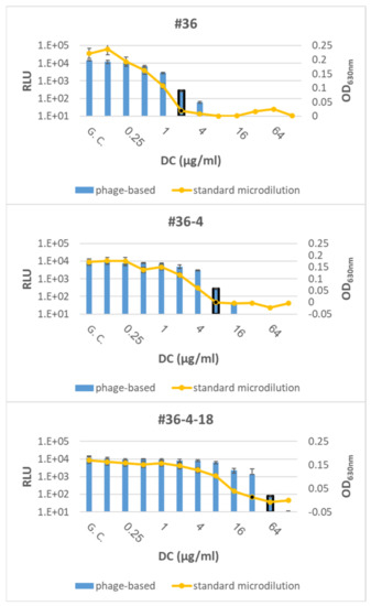 The accuracy of the phage-based AST was assessed by testing Y. pestis Kimberley53Δ70Δ10 derivates with various MIC values (representing different susceptible categories; Table 2; [16]) for DC or CIP (Table 1). DC was selected as a representative of protein synthesis inhibiting antibiotics (required a 7 h exposure period), and CIP was selected as a representative of DNA replication inhibiting antibiotics (requires 14 h of antibiotic exposure). Both antibiotics are recommended by the CDC for plague treatment. As shown in Figure 3, two of the derivatives with reduced susceptibility to DC resulted in the same MIC values as the standard microdilution test, while the phage-mediated MIC of the third derivative (#36-4-18) was twofold higher than the standard microdilution MIC; however, there was no change in its susceptible category, which was defined as resistant. Moreover, all three derivatives with reduced susceptibility to CIP resulted in the same MIC value as that obtained in simultaneous microdilution AST (Figure 4).