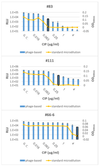 In the present article, we further adjusted the usage of the ϕA1122::luxAB reporter phage for rapid ID followed by AST toward additional antiplague recommended antibiotics, gentamycin, ciprofloxacin and doxycycline [11,39] and for additional relevant scenarios of both clinical and environmental settings. In addition, we optimized the assay to obtain correct MIC values and validated the assay by using Y. pestis derivates with various MIC values.