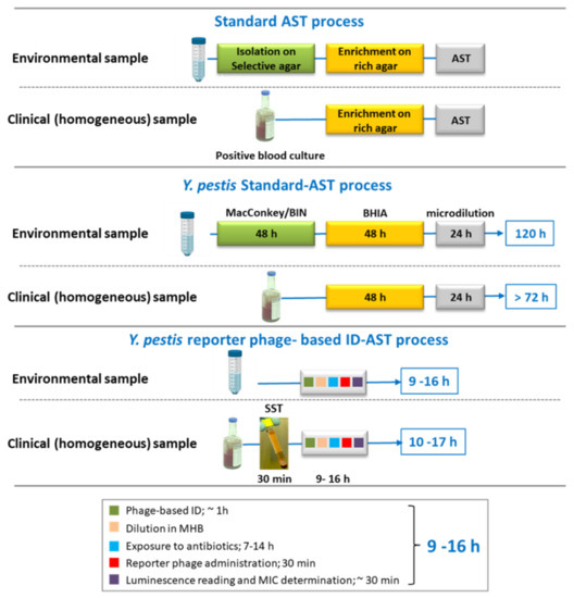 To shorten the several days process of Y. pestis standard AST (Figure 7), various methods were developed. Those methods eliminate the pre-AST culturing step and/ or the AST step. For example, we have previously developed a rapid molecular AST, in which molecular alterations (quantifies by qRT-PCR) in the expression of specific mRNA markers, occurring soon after bacterial exposure to antibiotics, are translated to MIC values [17,22]. The molecular AST shortens the 24 h needed for the microdilution AST to 7 h assay (toward ciprofloxacin or doxycycline) [17,22]. Moreover, the molecular AST can be conducted directly on human blood culture derived Y. pestis with no need for the 48 h prior enrichment step [22]. However, as the gene expression profile is specific to the tested bacteria-antibiotic combination, a preliminary transcriptomic analysis and selection of proper mRNA markers should be performed for any additional antibiotic in question. In addition, specific primer sets for each tested antibiotic are required. Therefore, molecular AST, although rapid, is expensive and requires special devices and highly skilled laboratory employees, hence limiting its applicability in simple clinical laboratories or in point-of-care (POC) diagnostics. To overcome these limitations, we searched for a simple, inexpensive and rapid ID-AST method that can identify Y. pestis and follow its growth and viability directly from homogenous or heterogeneous culture, avoiding elongated isolation and/or enrichment steps. As bacteriophages are specifically targeted to their bacterial host, using a reporter phage enables ID-AST to be conducted without the need for a preliminary isolation and/or enrichment step.