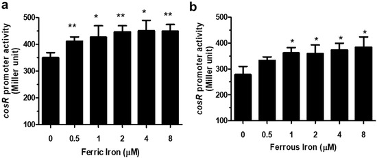 Positive regulation of cosR transcription by iron. The PcosR::lacZ fusion assay was conducted by supplementing MEMα with different concentrations of Fe3+ (a) and Fe2+ (b). The results show the means and standard deviations of three samples in a single experiment. The experiment was repeated three times, and similar results were obtained in the repeated experiments. The statistical analysis was performed using Student’s t-test in comparison with the control without iron. *: p < 0.05, **: p < 0.01.