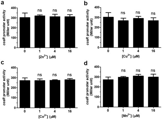 Irresponsiveness of cosR transcription to divalent metal ions other than iron. The PcosR::lacZ fusion assay was conducted with Zn2+ (a), Cu2+ (b), Co2+ (c), and Mn2+ (d). The results show the means and standard deviations of three samples in a single experiment. The experiment was repeated three times, and similar results were obtained in the repeated experiments. The statistical analysis was performed using Student’s t-test in comparison with the control without ions. ns: not significant.