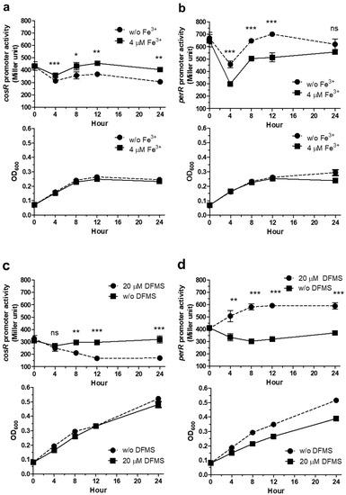 Effects of iron on the transcription of cosR and perR over the growth of C. jejuni. The PcosR::lacZ and PperR::lacZ fusion assays were conducted in the presence and absence of iron in MEMα and MH media: (a) PcosR::lacZ assay in MEMα. (b) PperR::lacZ in MEMα. (c) PcosR::lacZ assay in MH. (d) PperR::lacZ in MH. Deferoxamine mesylate (DFMS) was used as an iron chelator in MH media. The growth of C. jejuni is indicated with the optical density at 600 nm (OD600) in each panel. The experiment was repeated three times, and similar patterns of results were obtained in the experiments. The statistical analysis was performed using Student’s t-test by comparing the samples with and without iron at the same sampling point. *: p < 0.05, **: p < 0.01, ***: p < 0.001.